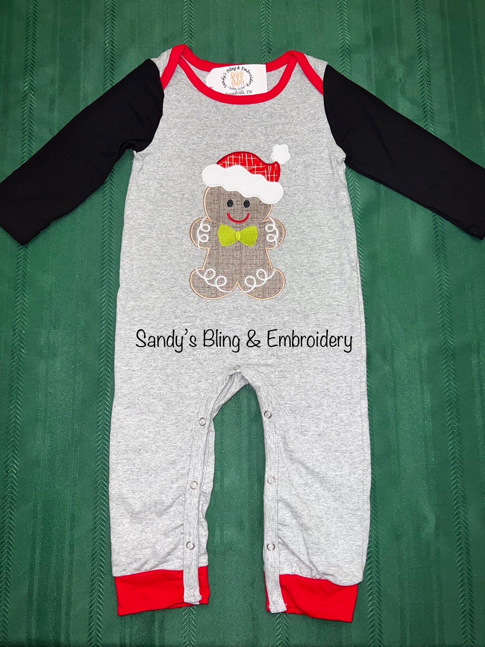 Romper with Christmas Gingerbread Man Appliquéd on front.
